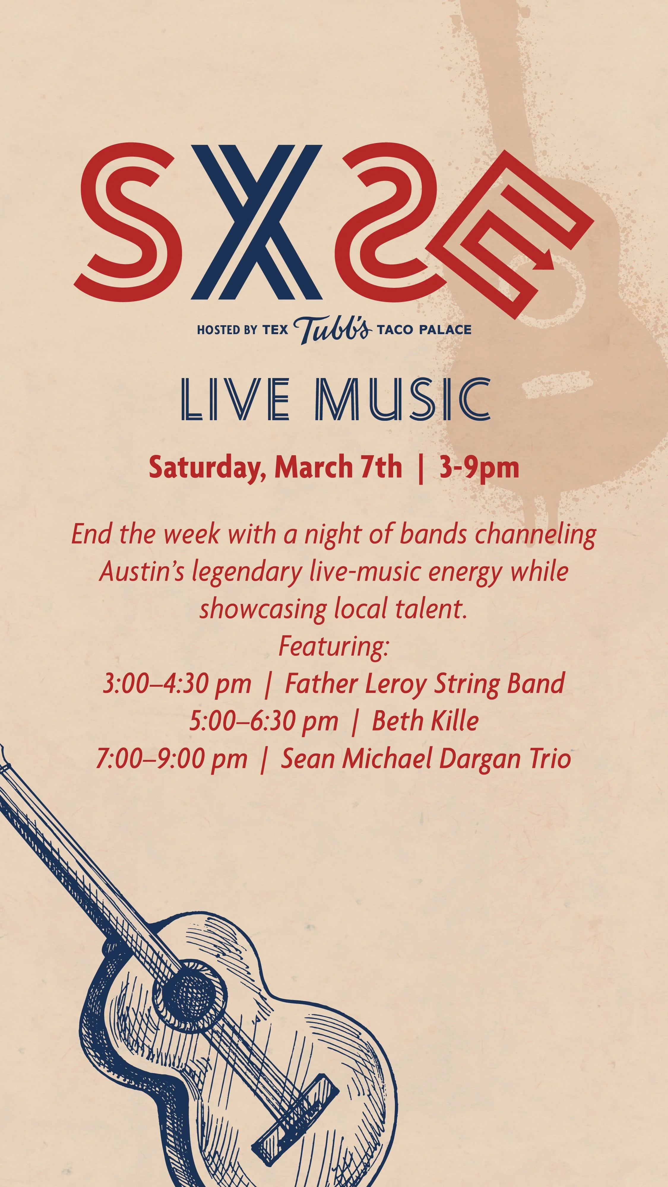 Saturday 7 March ‘26 — Tex Tubb’s Taco Palace — Madison, WI 7pm (Trio)